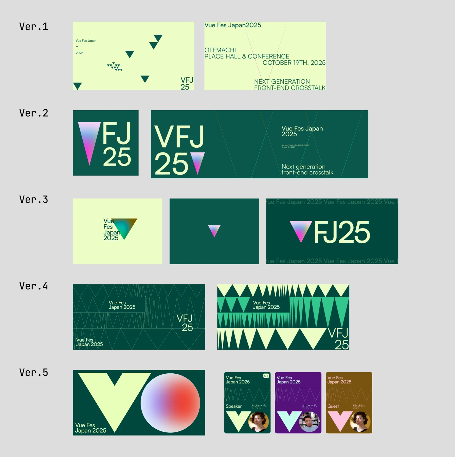 デザイン試作では、まずVer.1でVue.jsのロゴを思わせる三角形を散りばめ、全体像を構成する案から始まりました。