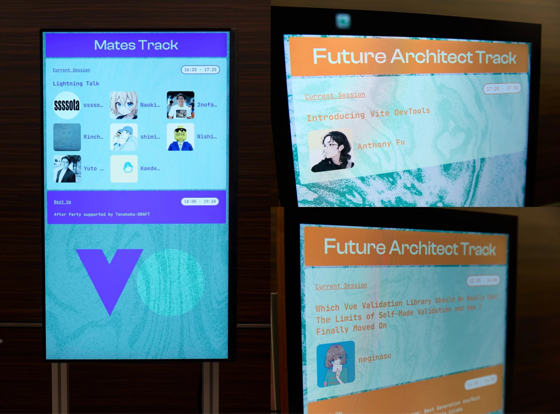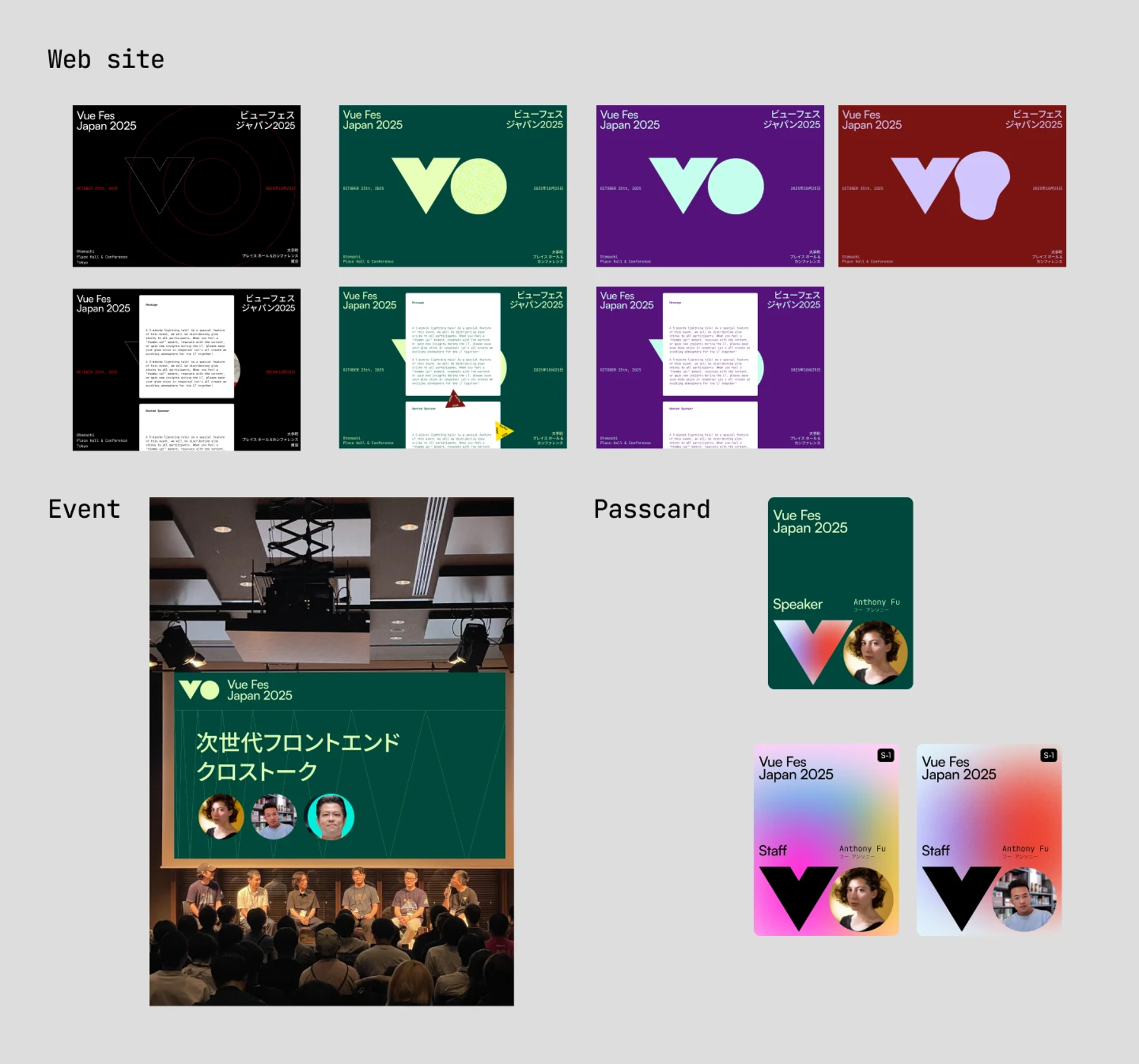 まずは過去のVue Fes Japanの写真や資料を振り返って全体の流れを把握しつつ、日本国内外のカンファレンスやデザイントレンドのリサーチも重ねて、プロジェクトの全体像と雰囲気を掴んでいきました。