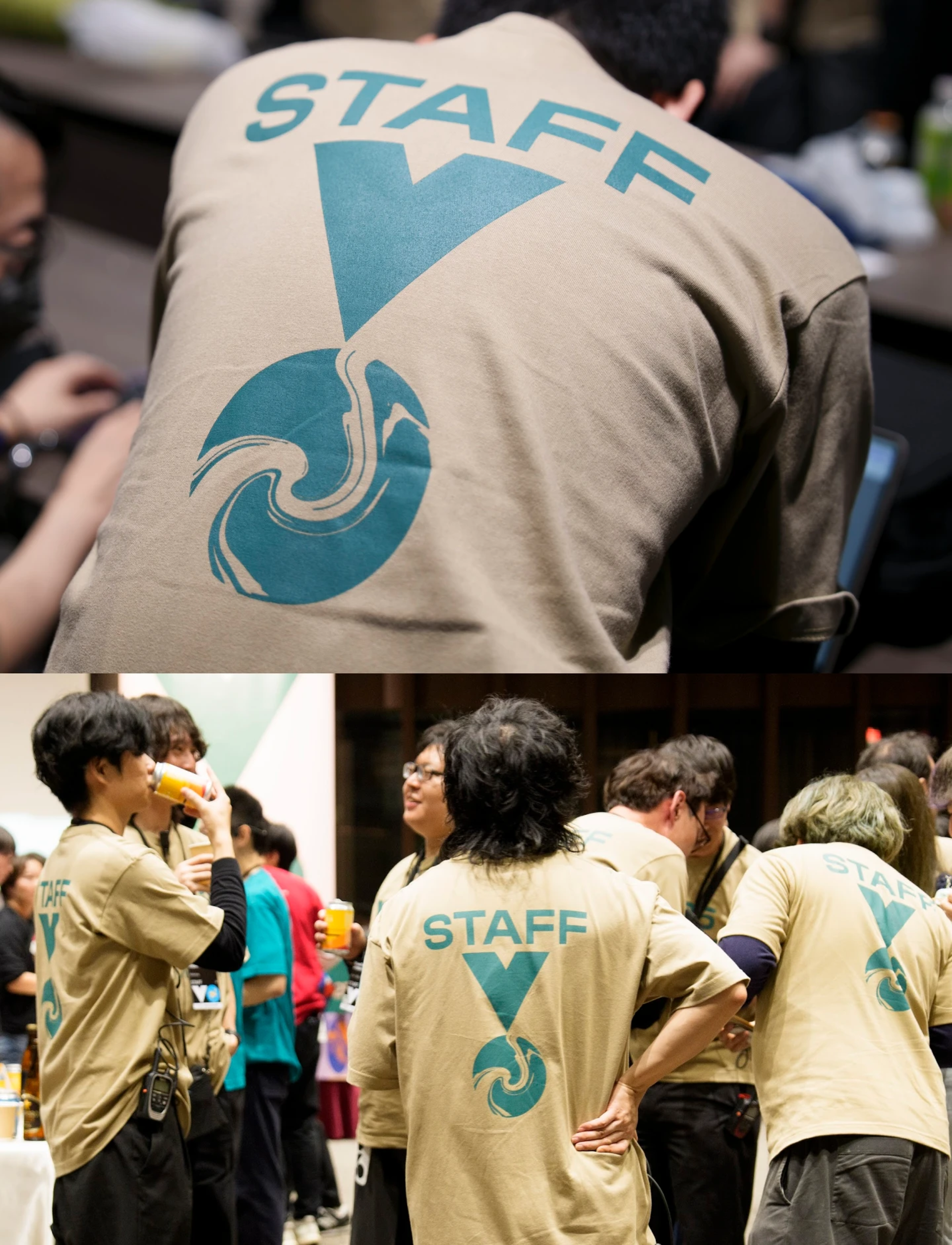 スタッフTシャツのデザインも担当しました。Tシャツといえば黒地に大きく「STAFF」と入れるのが定番ですが、イベントが10月後半の少し肌寒い季節ということもあり、来場者の服装が黒っぽくなりそうだと考え、ひと目でスタッフだと分かるアース系のカラーを選びました。